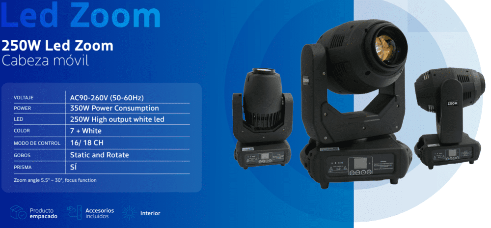 La luminaria LED de 250W está fabricada con un nuevo tipo de plástico de ingeniería de alta resistencia térmica y carcasa de aluminio fundido, ofreciendo una apariencia atractiva. El equipo está diseñado y fabricado cumpliendo estrictamente con los estándares CE y el protocolo internacional DMX512.