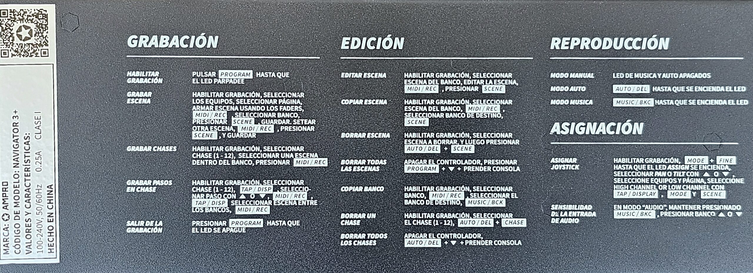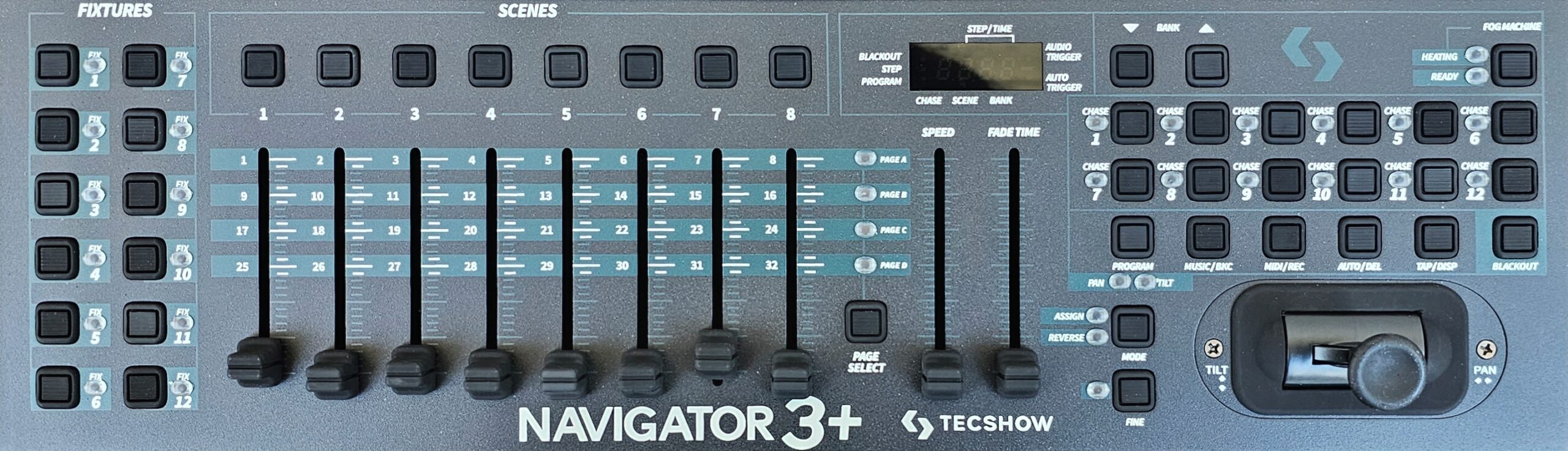 Navigator 3+ es un controlador multifunción que puede ser utilizado como una consola DMX y, también, como un controlador MIDI. En su faceta DMX el equipo cuenta con un total de 384 canales, pudiendo controlar hasta 32 parametros en las 12 luminarias que soporta. Navigator 3+ tiene 30 bancos de memoria con 8 escenas programables por banco, a la vez que cuenta con 12 chases con 240 pasos por cada uno. Un display de gran tamaño, la total integración de MIDI y la incorporación de un joystick de alta precisión para manejar los movimientos de las luminarias son algunas de las características que lo hacen uno de los controladores más completos de su segmento.