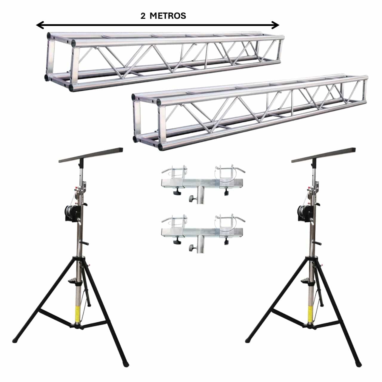 / KIT SUBE HASTA 4 MTS PARA 150 KILOS 4 METROS TRUSS 24X24 ALUMINIO+ 2ADAPTADORES +2 ATRILES +2 BARRA FOCO